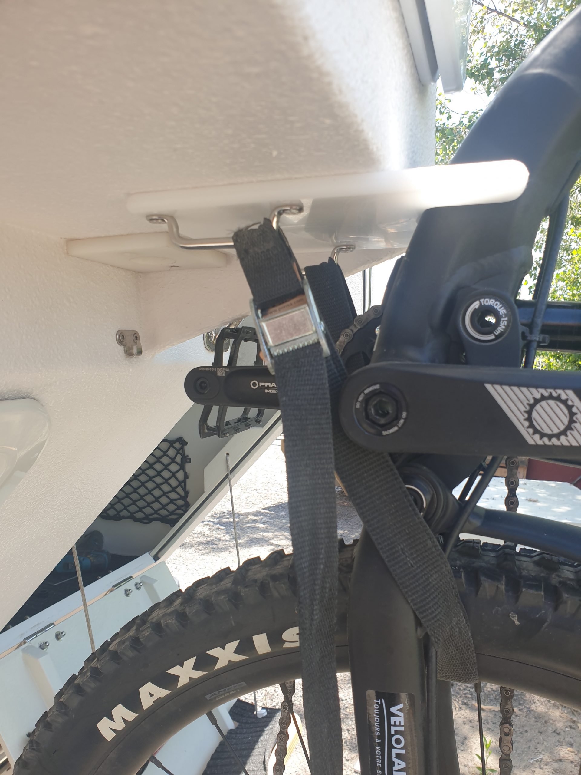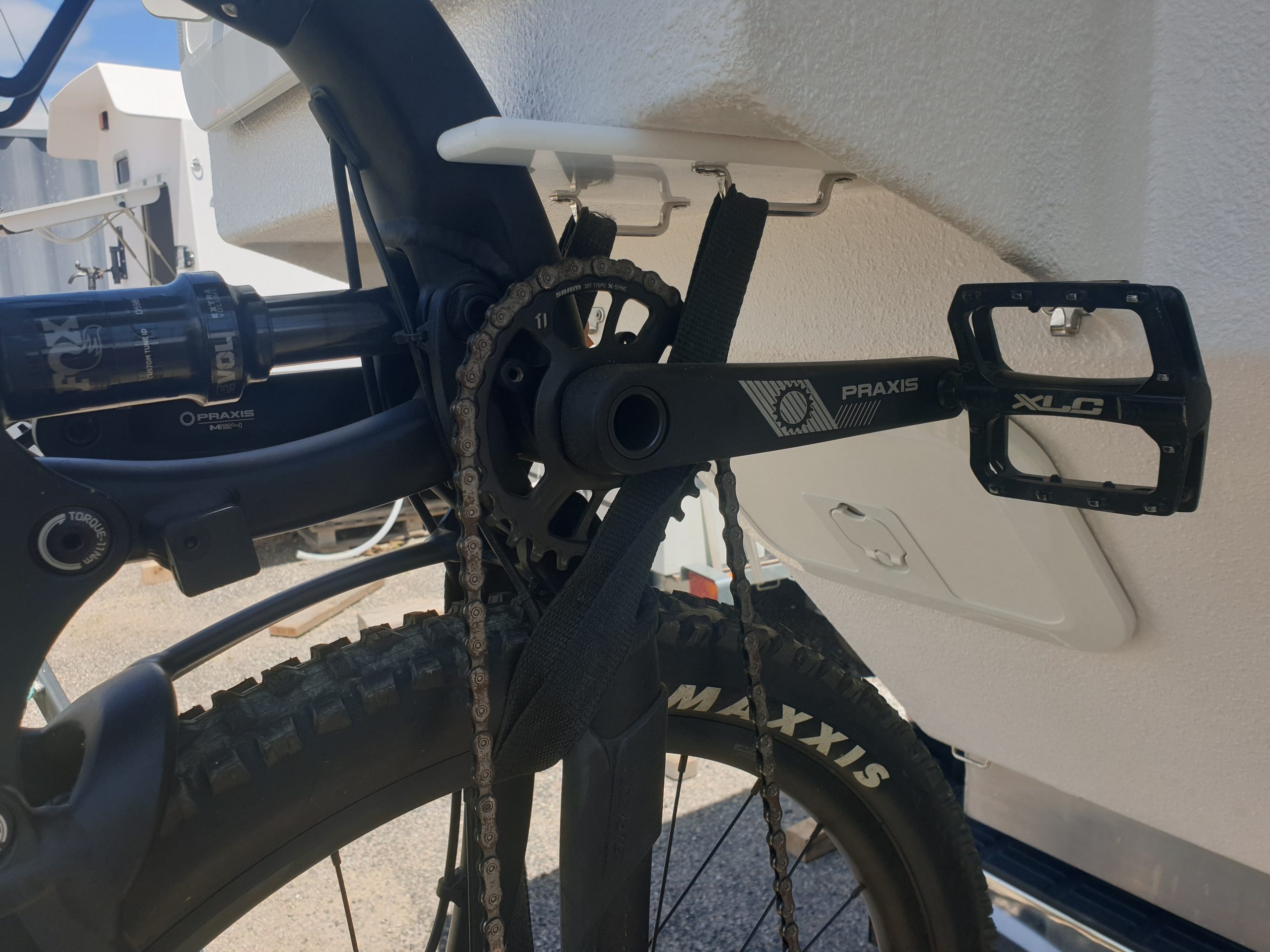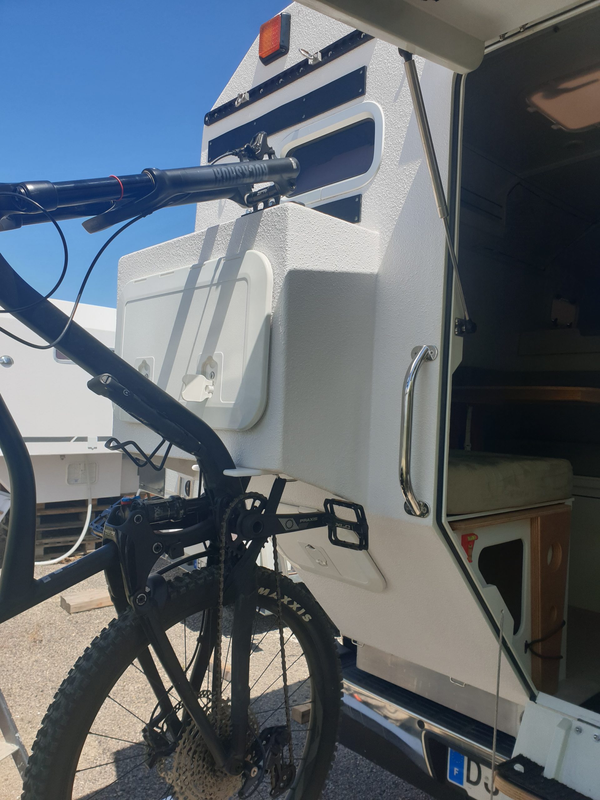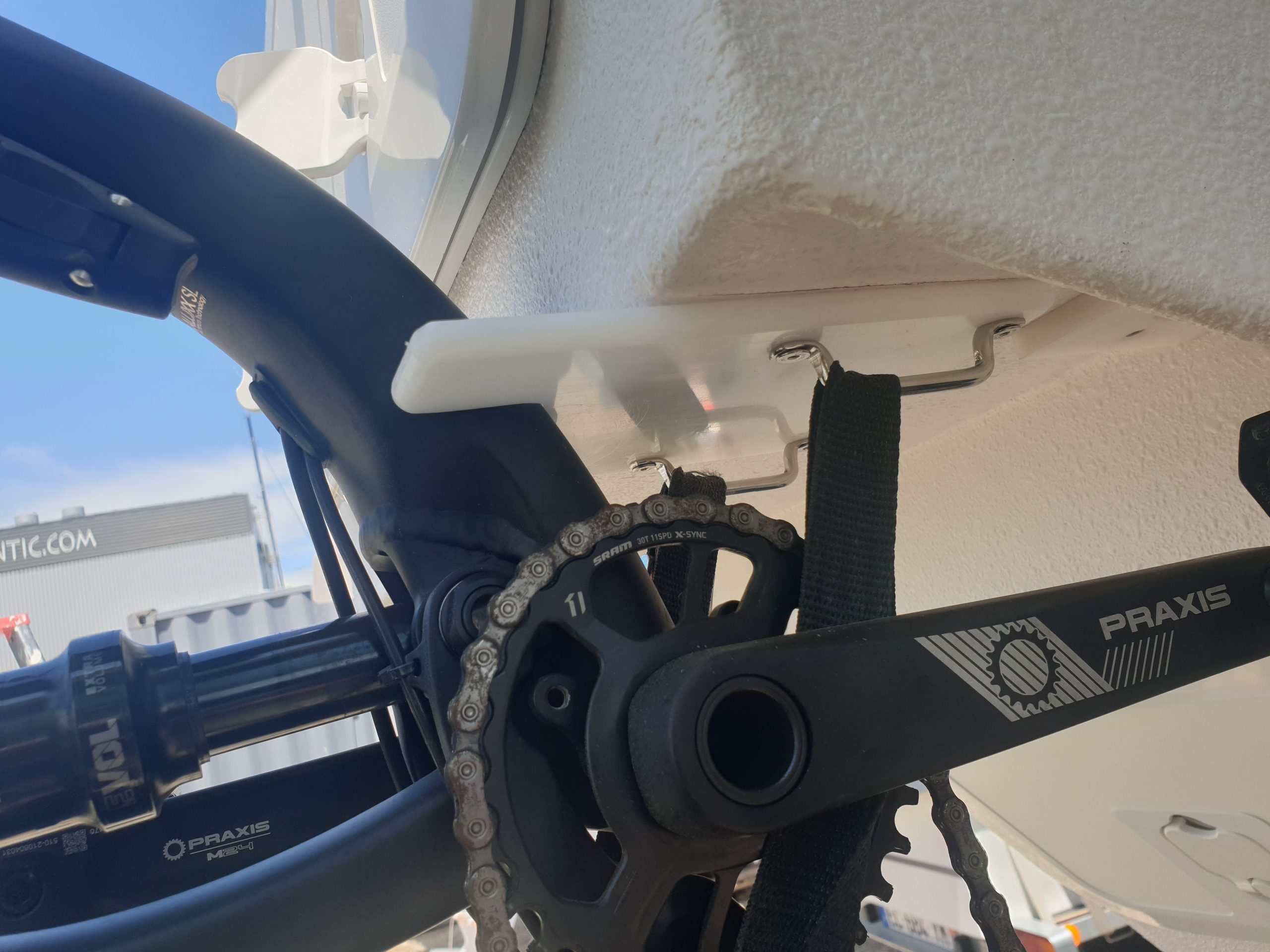 Le pédalier ou le cadre (en fonction de la taille du vélo) est bloqué par une platine en téflon. La roue arrière est soutenue par des pontets et des sangles. L’ensemble est conçu pour résister aux contraintes du voyage et est directement fixée à la cellule, et non au véhicule. C’est parfaitement adapté aux conditions de voyage, sur route comme en tout-terrain.
